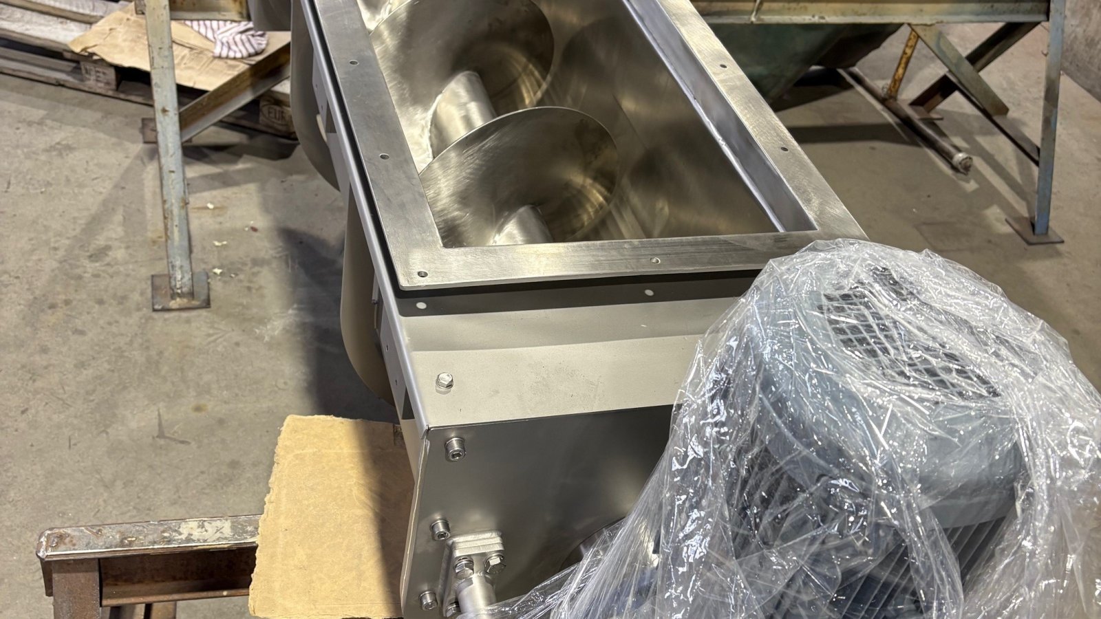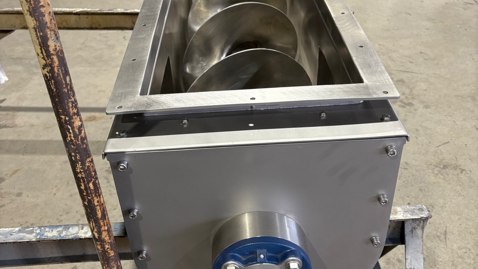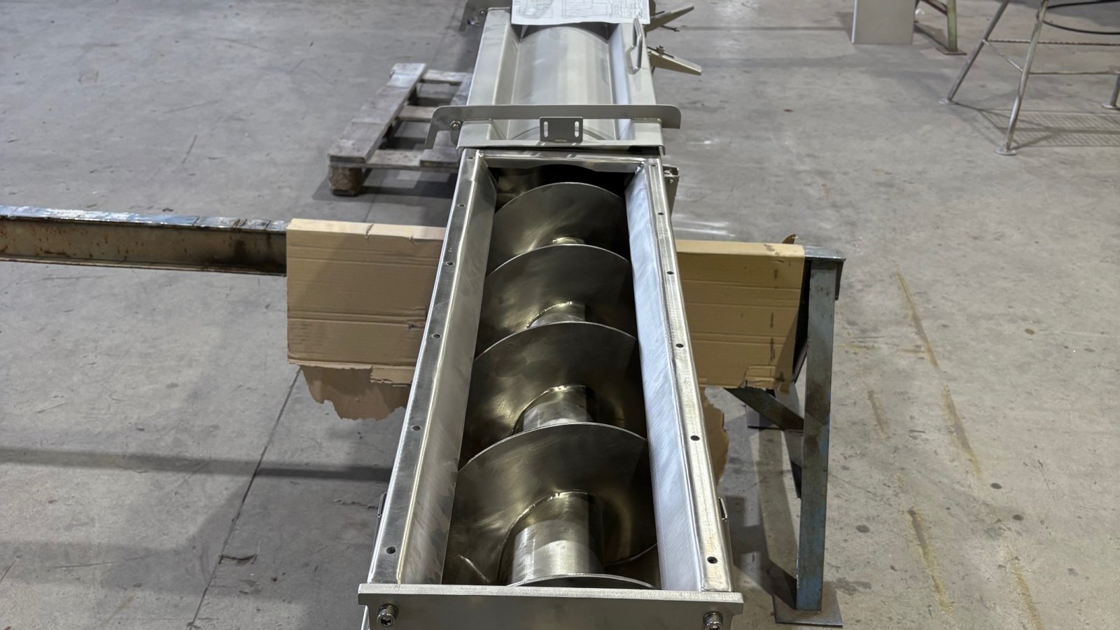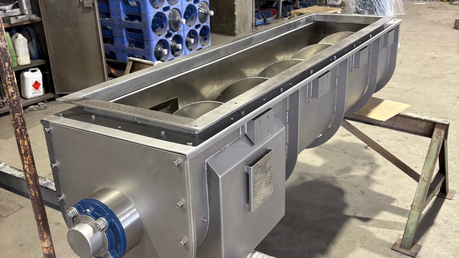 working element - the screw. After the production process, it is possible to lift the covers in order to clean the unit. The openable lids are fitted with a sensor that stops operation if the lid is opened during operation. Both the infeed and outfeed of the unit are matched to the equipment in the production line where the screw conveyor is located. Depending on the location and production technology of the line in which the device is located, the geared motor can be fitted with a protective cover. Machine components in contact with the product are made of austenitic acid-resistant steel and elastomers approved for contact with foodstuffs. The conveyor is driven by a geared motor with power depending on the size and capacity of the device.
