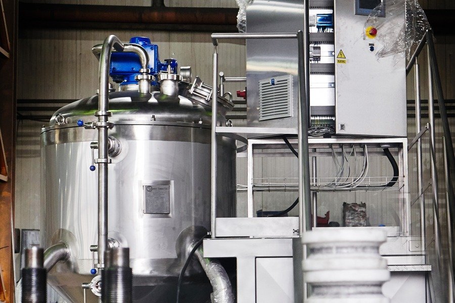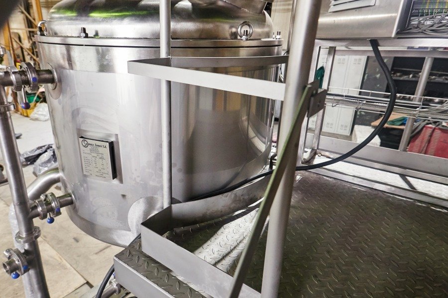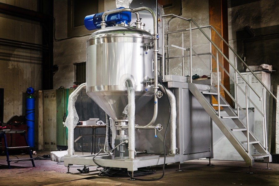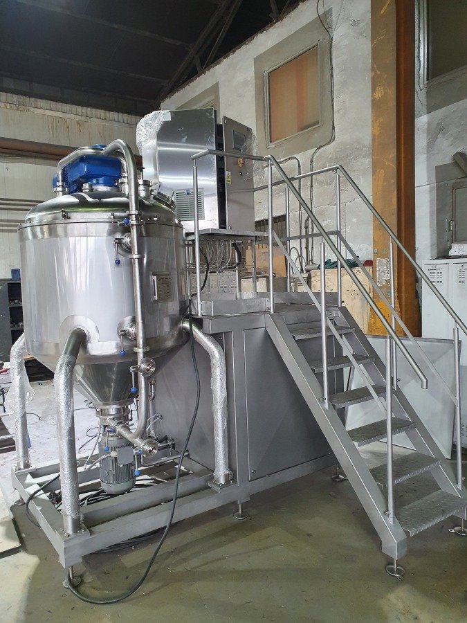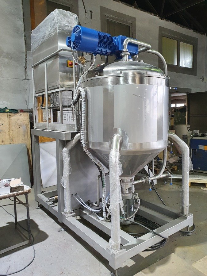 - Zbiornik podciśnieniowy (- 0,9 bar) z płaszczem pikowanym wodnym, izolowany, z homogenizatorem umieszczonym w dennicy dolnej, z mieszadłem skrobakowym, z łamaczami fal posadowiony na nogach stacjonarnych
