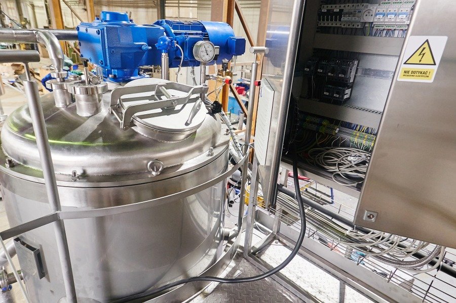 - Reaktor technologiczny, mieszalnik produktu z pionowym homogenizatorem podzbiornikowym oraz mieszadłem ramowo kotwicowym z łamaczami fal.