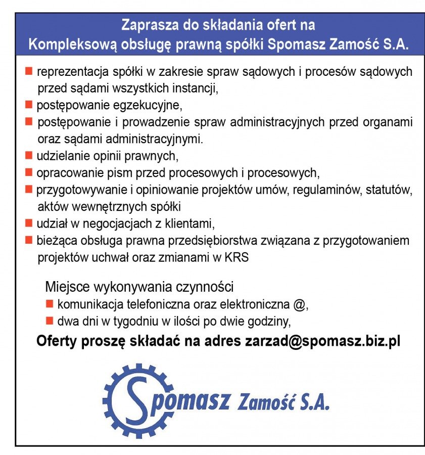 Zainteresowane podmioty proszone są o kontakt z zarządem spółki Spomasz Zamość S.A.