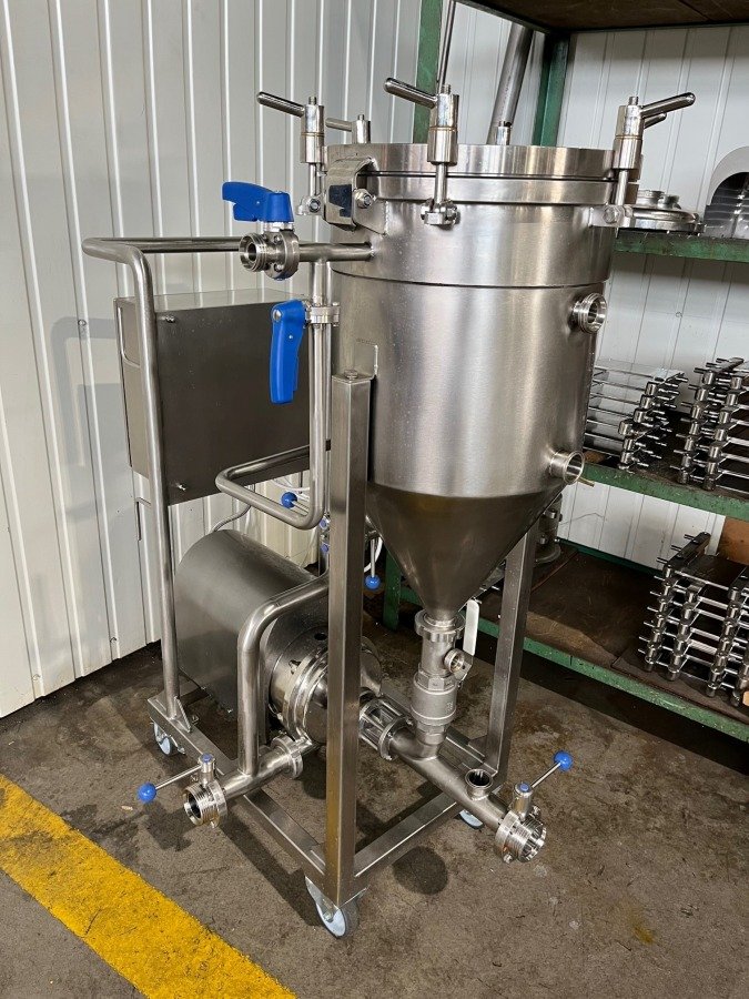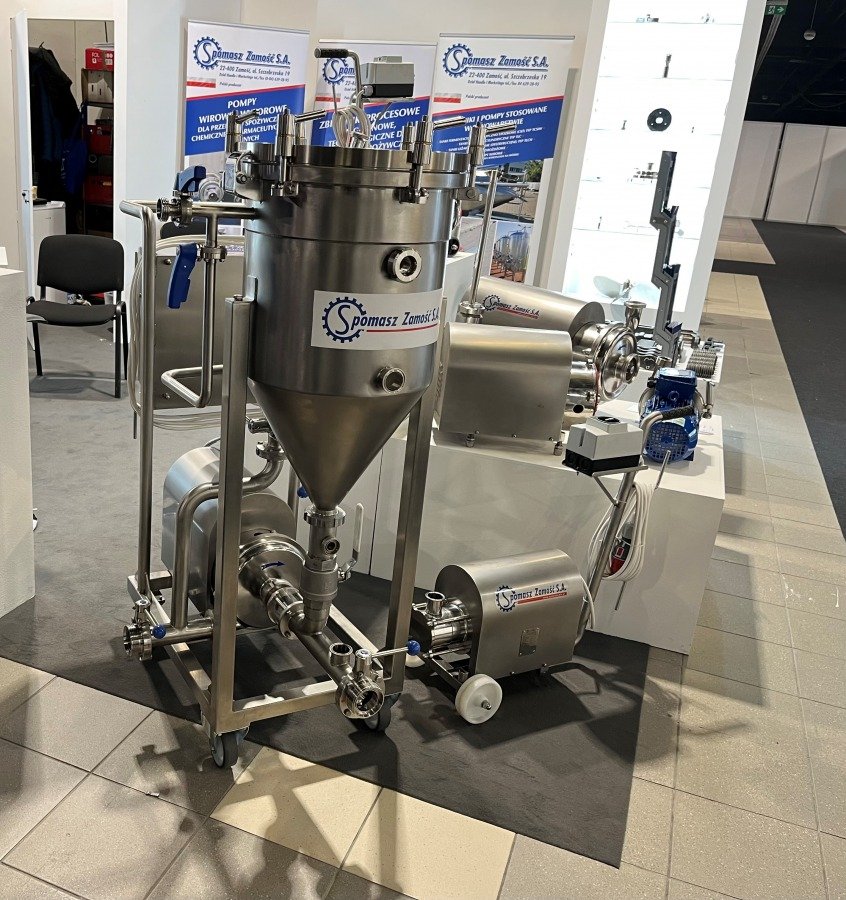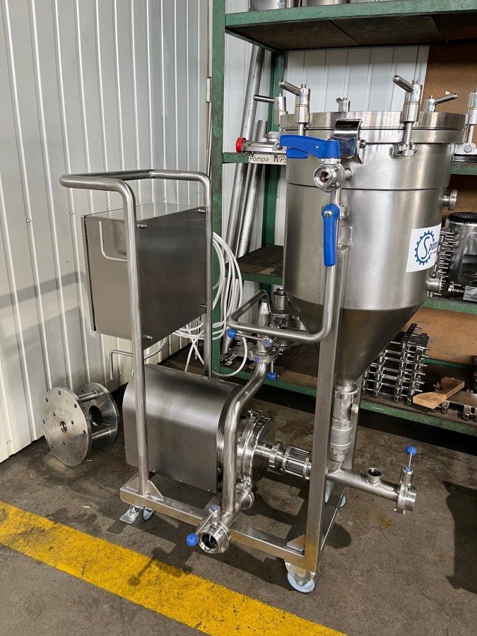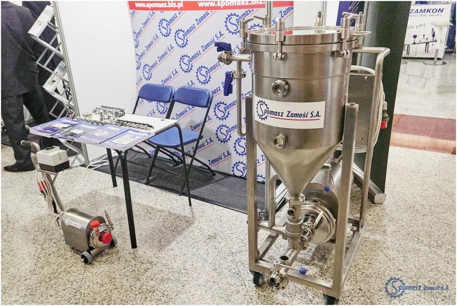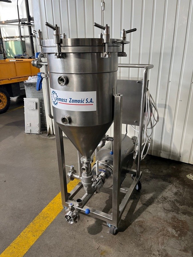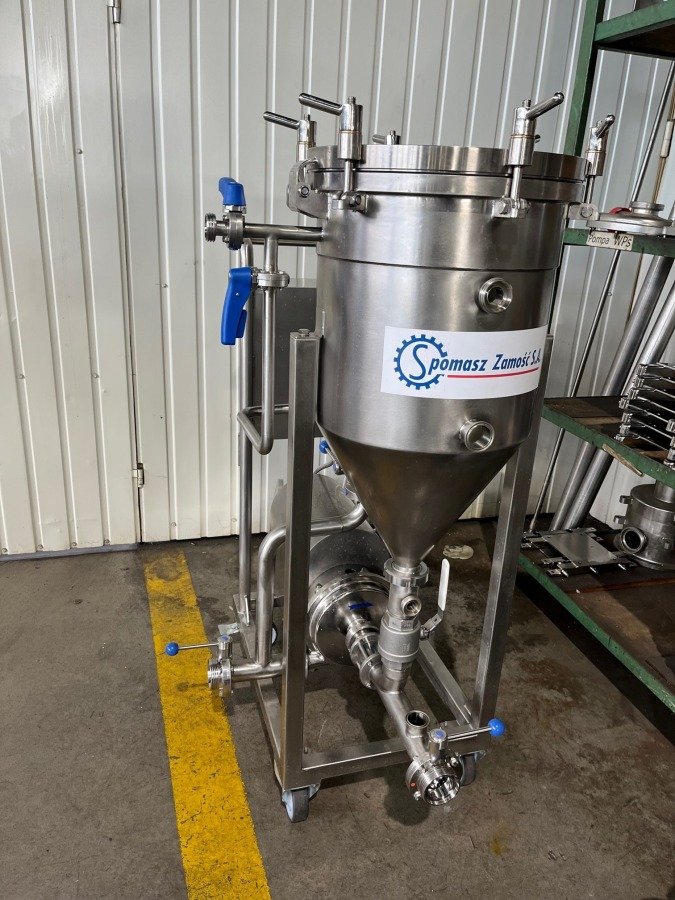 Zasobnik w formie zbiornika walcowo stożkowego. Zasobnik przystosowany do pracy pod ciśnieniem produktu, wyposażny we właz ze szklaną pokrywą, niezbędne przyłacza oraz głowicę myjącą. Pojemność robocza zasobnika wynosi 50L.