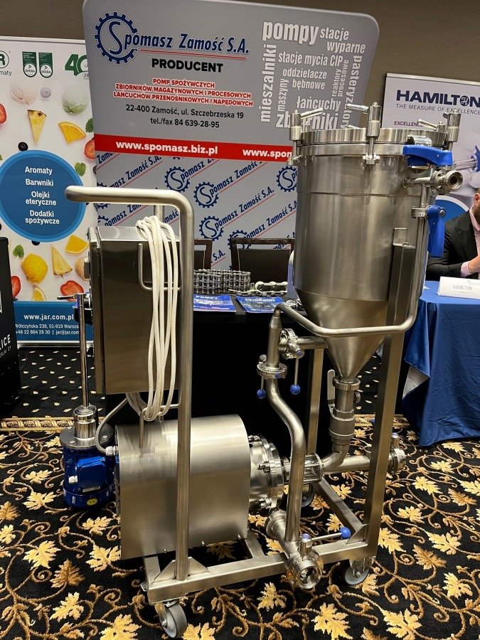 - Na spuście zbiornika zamontowany homogenizator typu rotor/stator, silnik min 11 kW, 3000 obrotów/min pionowo.