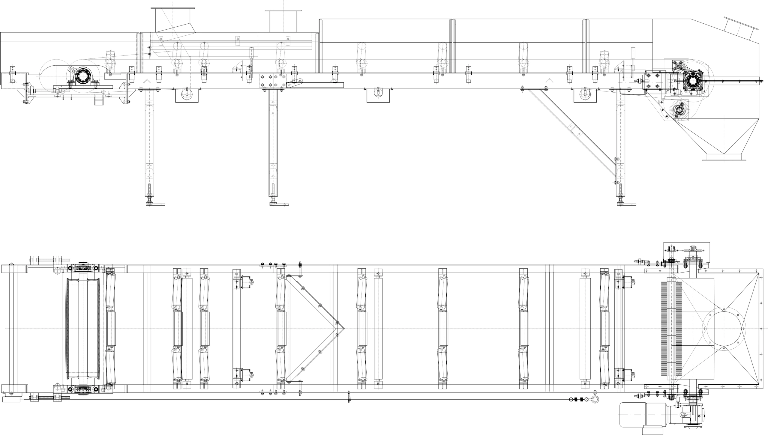 Zarówno zasyp jak i wysyp urządzenia dopasowane są do urządzeń znajdujących się w linii produkcyjnej, w której znajduje się przenośnik. W zależności od miejsca posadowienia i linii technologicznej, w której znajduje się urządzenie, motoreduktor może być wyposażony w osłonę ochronną. Przenośnik napędzany jest motoreduktorem o mocy zależnej od wielkości i wydajności urządzenia.