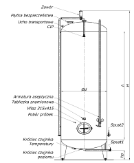 Przykładowo ZIW30-300M2Ł oznacza zbiornik izolowany, wyposażony w system grzania lub chłodzenia, o pojemności 30m³ i średnicy wewnętrznej zbiornika 3.000 mm wyposażony w mieszadło pionowe łopatowe.